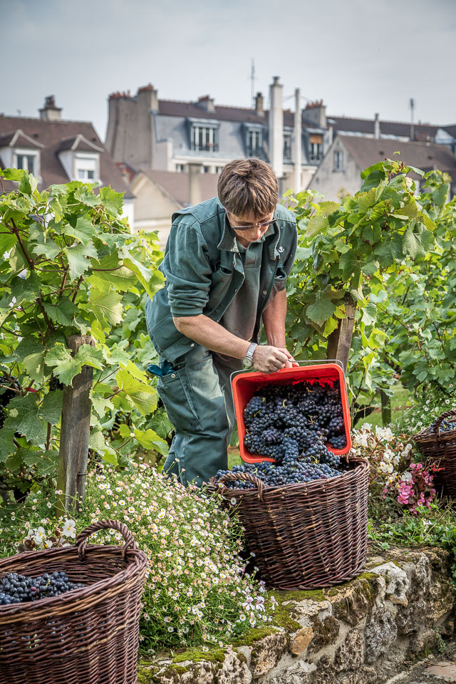 Chaque année, élus du XVIIIème, à Paris, agents des espaces verts de la ville et bénévoles du comité d'action sociale de l'arrondissement se retrouvent pour cueillir le raisin de la vigne de Montmartre, avant de le presser et le mettre en cuve dans les caves de la mairie. Vendue lors des fêtes des vendanges l'année suivante, la production de ce vin permet de financer les actions sociales du comité.