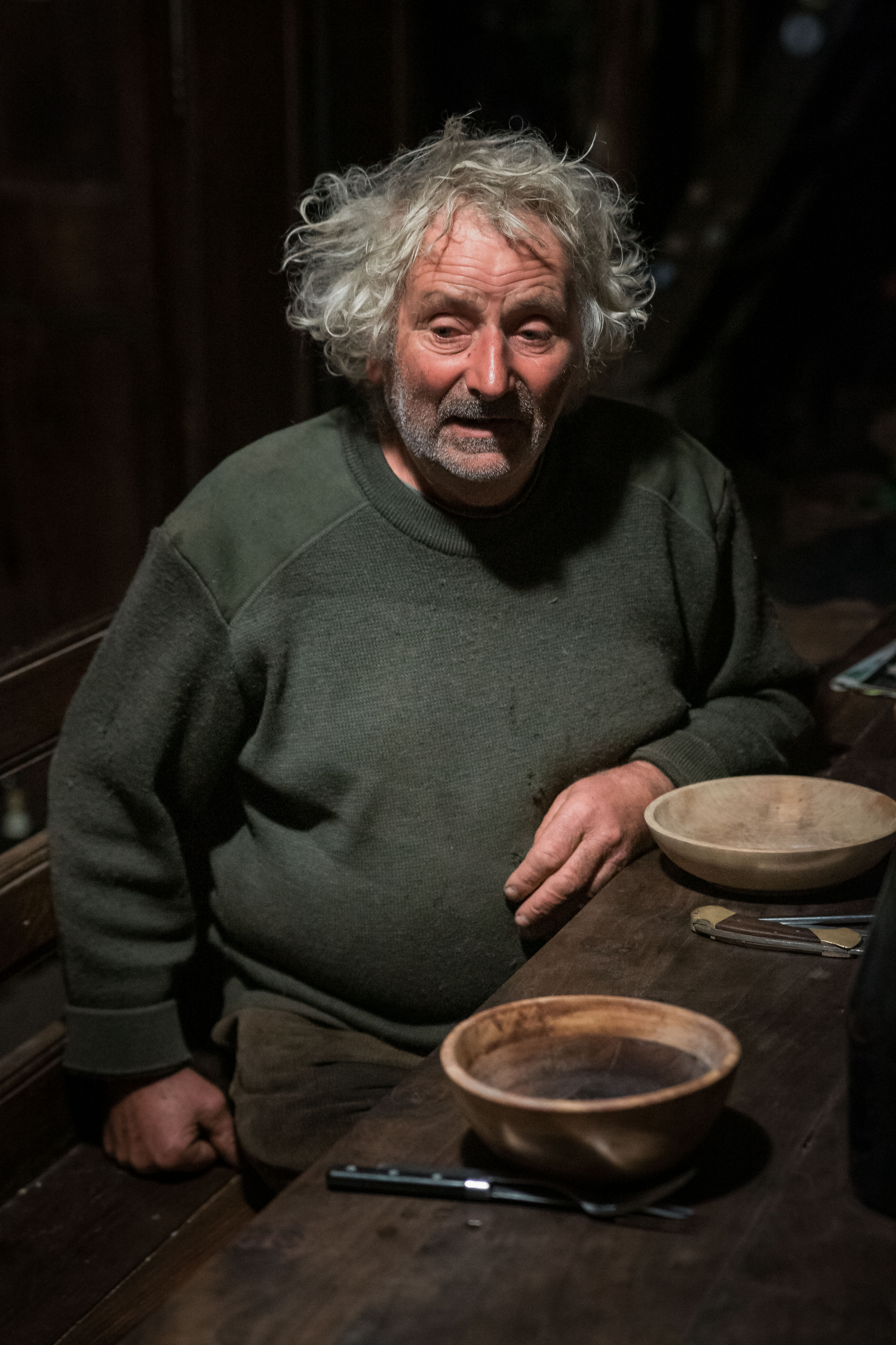 Jean-Bernard, 75 ans mange dans une écuelle en bois qu’il retourne simplement après le repas de midi pour la réutiliser au dîner.