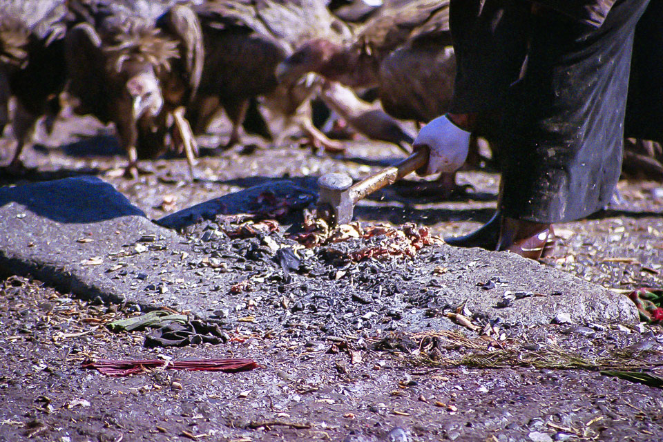 Au Sichuan, dans le Tibet de l’est, une zone annexée par la Chine bien avant la province actuelle de la région autonome, la culture tibétaine est encore très présente, la sinisation y étant moins virulente. Dans un monastère interdit d’accès par la police aux étrangers, on officie des funérailles célestes : dans une région où les températures sont souvent basses et où le bois manque, on n’enterre ni ne brûle les dépouilles. Elles sont dévorées par les vautours. Chaque jour, 4 à 5 familles apportent le corps d’un proche. Apres les prières et les tours de temple rituels, le corps porté sur le dos, dans un panier ou une grande boite, est apporté sur le lieu du rituel. Ses vêtements sont alors jetés dans la prairie voisine. Le corps est préparé par le moine qui en sépare des lambeaux de peau pour mettre la chair à nu et confie à la famille une touffe de cheveux ou la section de la tête d’un os, seule trace de son passage sur terre. Les corps prêts, le moine lance quelques morceaux de chair : c’est le signal pour les vautours qui se sont approchés . La disparition complète des corps, aidée par le moine qui broiera à la fin les os, durera moins d’une heure. ATTENTION ! Cette série comporte des images qui peuvent choquer la sensibilité de certaines personnes.